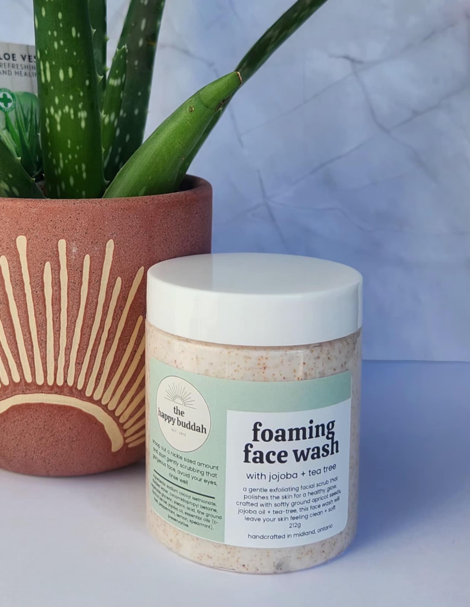 Whipped handcrafted face scrub, using fine ground apricot seed for a gentle exfoliation as well as pure Tea Tree essential oil (anti inflammatory, antimicrobial, possibly help with acne) Pure Peppermint essential oil (natural cleanser, antiseptic, soothes irritation due to acne) Spearmint essential oil (anti inflammatory) Lemon essential oil (detoxifying, cleansing)